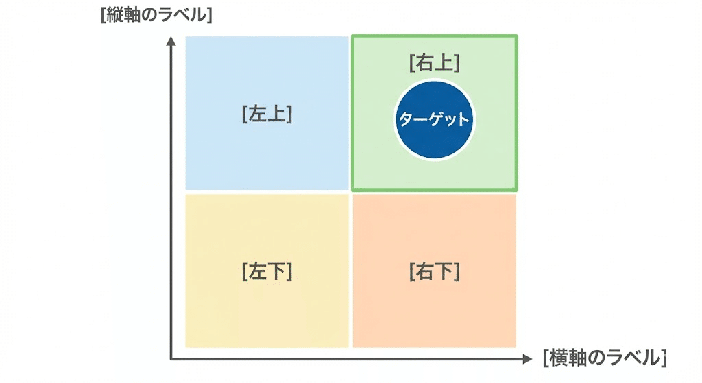 • メリット: 空いている象限を見せることで、「攻めどき」や「独自性」を強調できます。