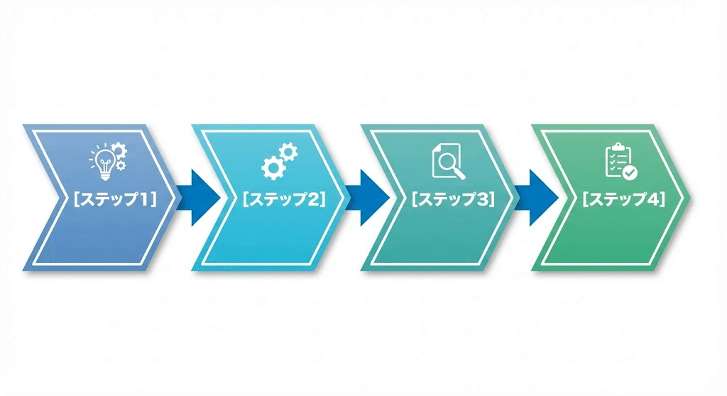 * Layout: (Linear progression from left to right. 4 main steps connected by bold arrows: "[ステップ1]", "[ステップ2]", "[ステップ3]", "[ステップ4]".)