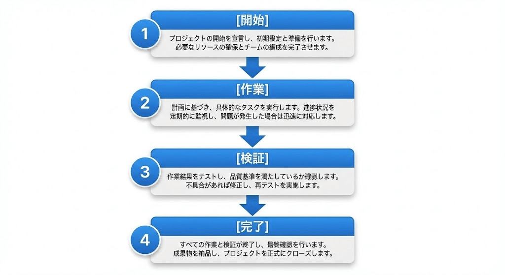 * Layout: (Top-to-bottom vertical progression. Boxes connected by downward arrows: "[開始]", "[作業]", "[検証]", "[完了]".)