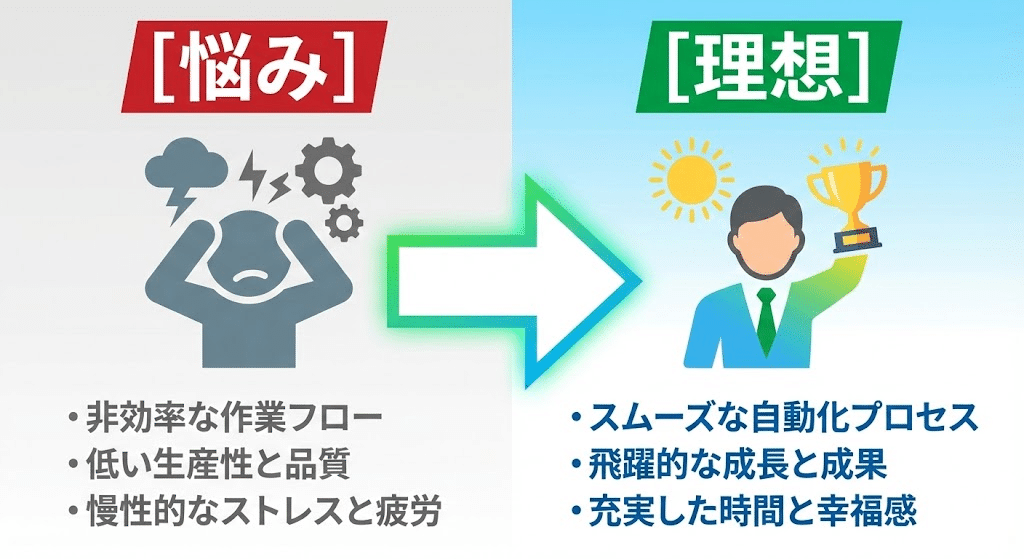 • メリット: 読者が抱える「悩み」と、手に入る「未来」の差を視覚的に叩き込みます。