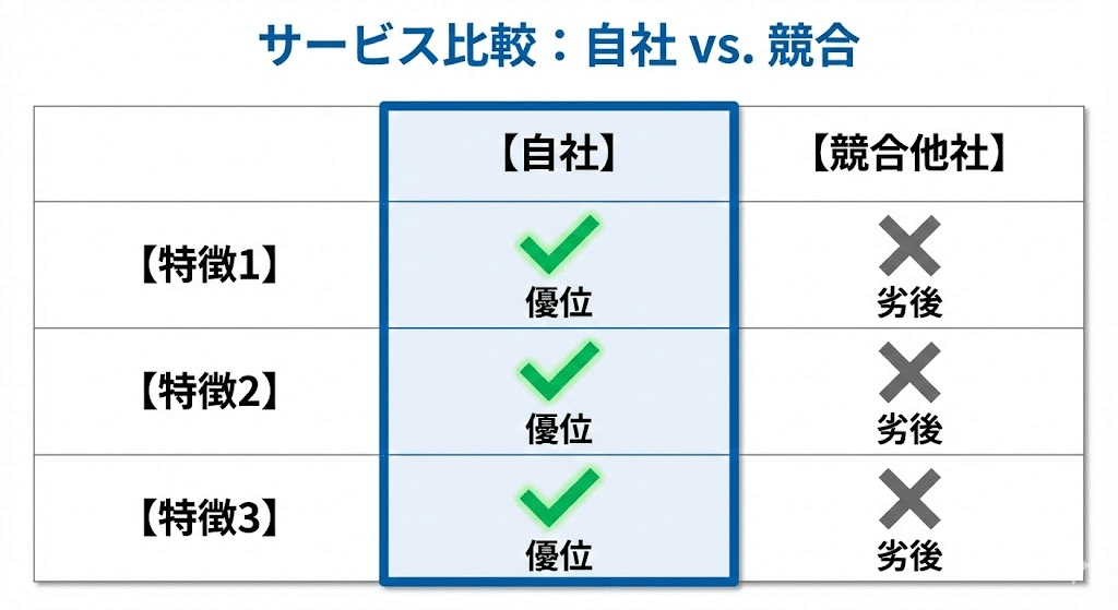 * Layout: (A grid comparing "Self" and "Competitor" across 3 features: "[特徴1]", "[特徴2]", "[特徴3]". Self column is highlighted.)