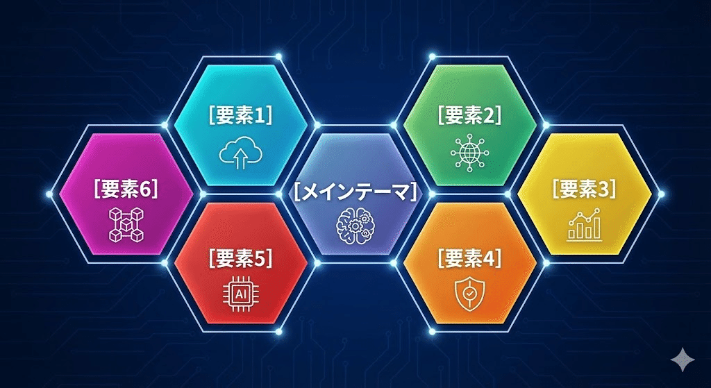 * Layout: (A cluster of 7 interlocking hexagons. Center: "[メインテーマ]", surrounding hexagons: "[要素1]" to "[要素6]".)