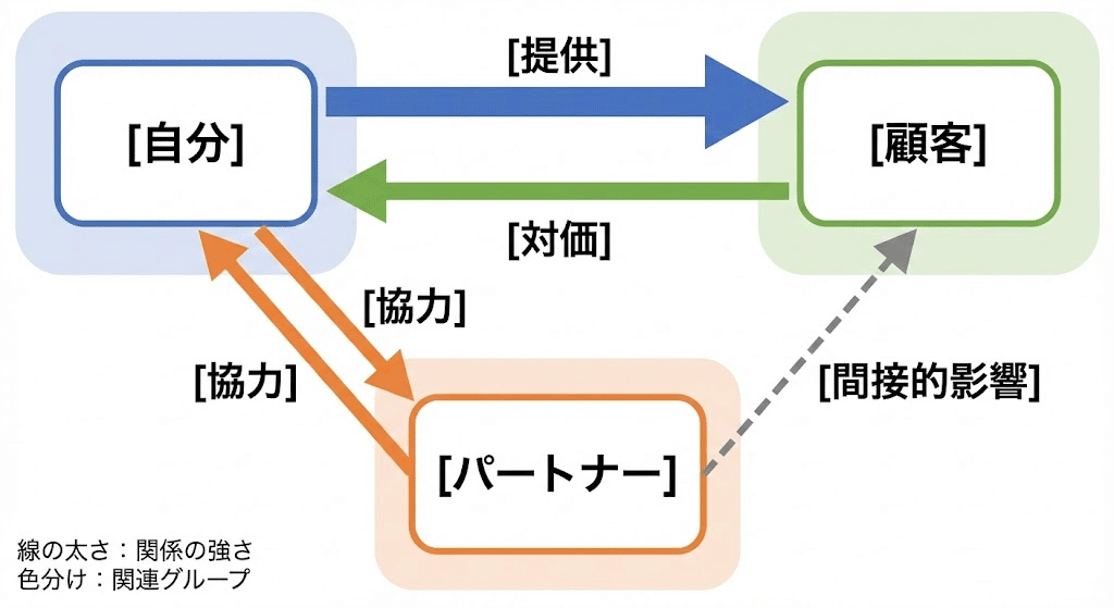 * Layout: (Nodes connected by directional arrows. Arrows labeled with relationship types like "[提供]", "[対価]", "[協力]". Key players: "[自分]", "[顧客]", "[パートナー]".)