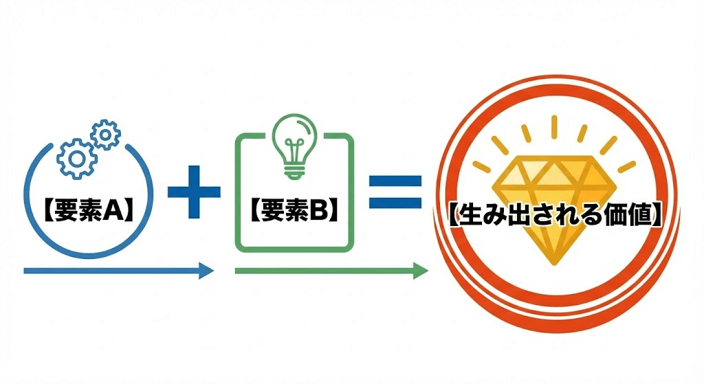 * Layout: (Horizontal equation: "[要素A]" + "[要素B]" = "[生み出される価値]". Use bold "+" and "=" symbols.)