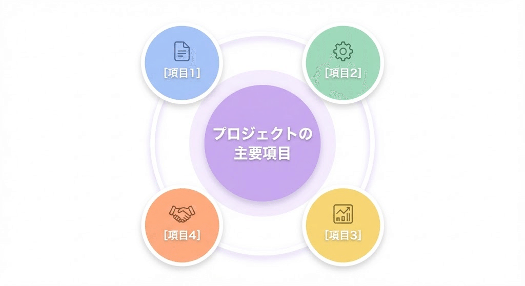 * Layout: (Circular arrangement of 4 circles around a central space. Labels: "[項目1]", "[項目2]", "[項目3]", "[項目4]".)