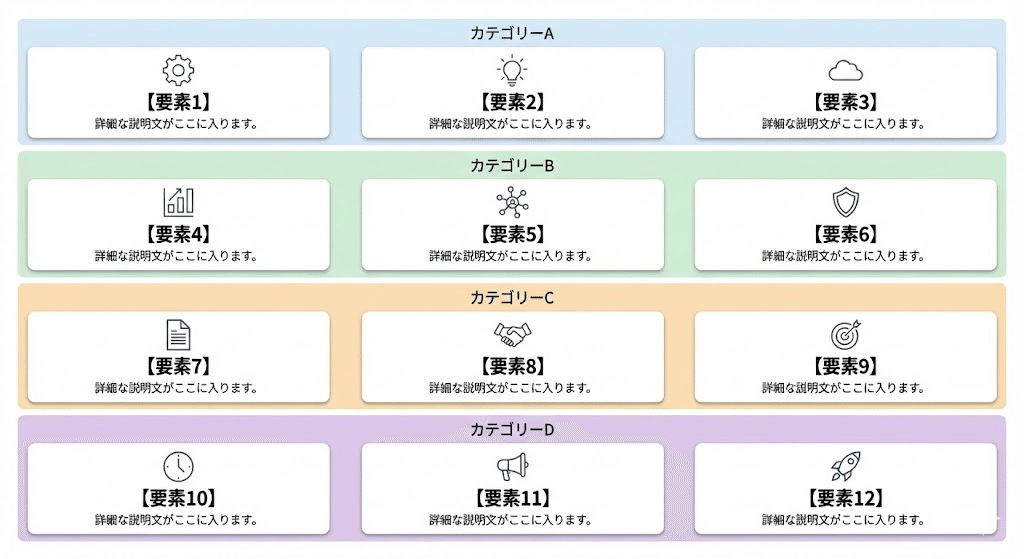 * Layout: (A structured grid layout for 12 items (3x4). Each item is a small card with a label: "[要素1]" to "[要素12]".)
