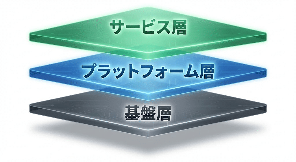 * Layout: (Vertical stack of 3 isometric planes. Top: "[サービス層]", Middle: "[プラットフォーム層]", Bottom: "[基盤層]".)