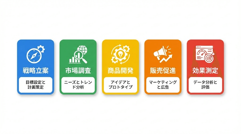 * Visuals: (Gradient colors along the circle. Smooth arrows showing clockwise movement. Bold Japanese text centered in segments.)