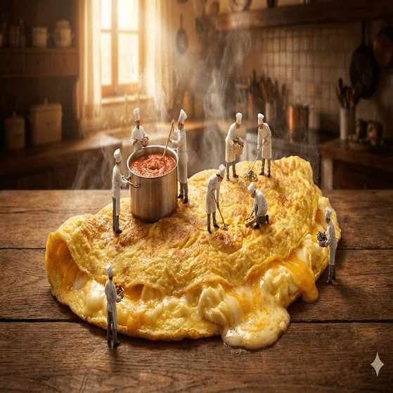 巨大なオムライスの上で、小さな職人たちが卵をふわふわに仕上げている動画。