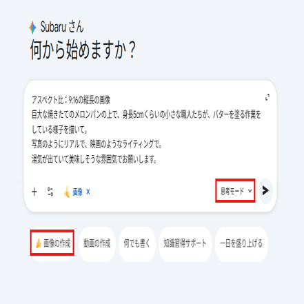 まずは「小人が巨大な食べ物の上で作業している画像」を作ります。 お使いの画像生成AI(Geminiなど)を開き、以下のように指示(プロンプト)を出してみてください。