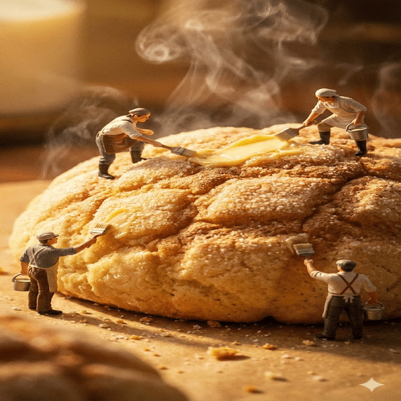「巨大な焼きたてのメロンパンの上で、身長5cmくらいの小さな職人たちが、バターを塗る作業をしている様子を描いて。写真のようにリアルで、映画のようなライティングで。湯気が出ていて美味しそうな雰囲気でお願いします。」