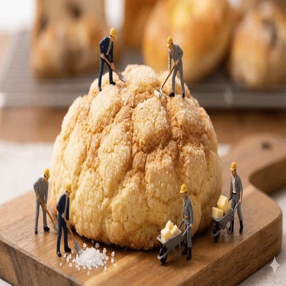 小さな職人たちは真剣かつ楽しげな表情で、巨大なメロンパンにバターを塗り広げている。動きは自然で滑らかだ。バターがジュワッと溶け、湯気が背景に立ち上っている。