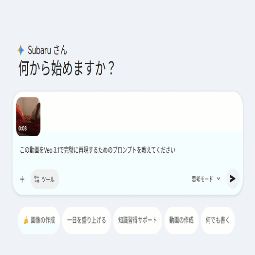 これだけで、Geminiは動画内の「光の当たり方」「液体の粘度」「人物の動き」「カメラワーク」を瞬時に解析し、Veo 3.1が最も理解しやすい形式のプロンプトを吐き出してくれます。