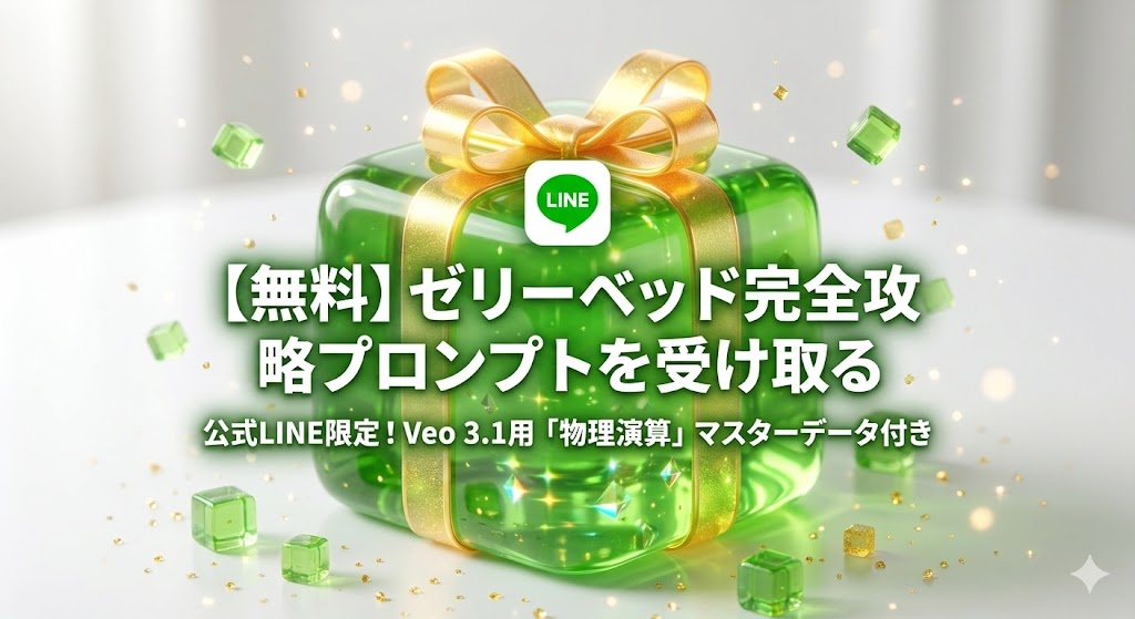 本編で紹介したプロンプトをベースに、Veo 3.1の物理演算エンジンとライティング機能を最大限に引き出すための【ゼリーベッド・マスタープロンプト】を公式LINEで配布します。
