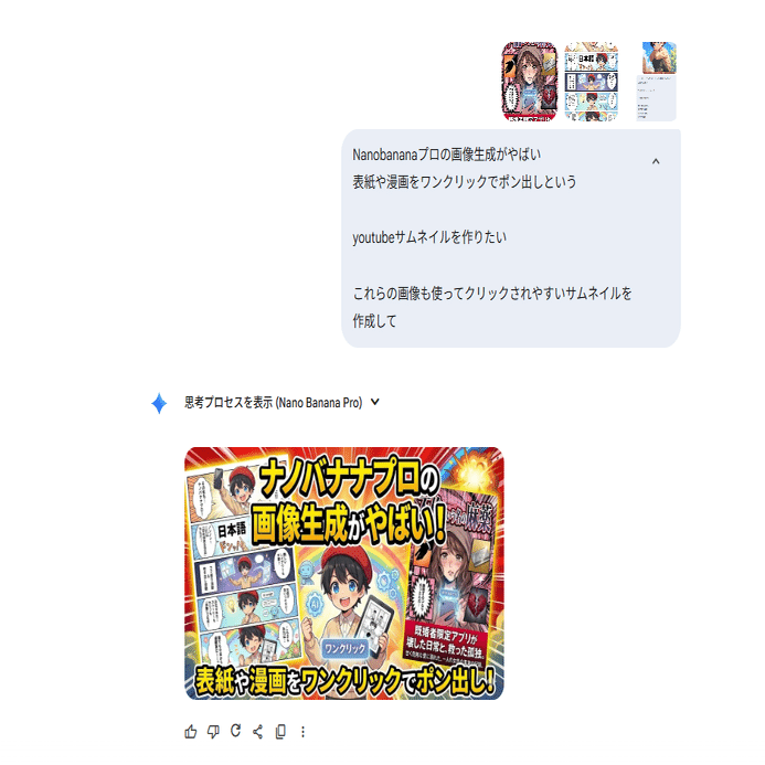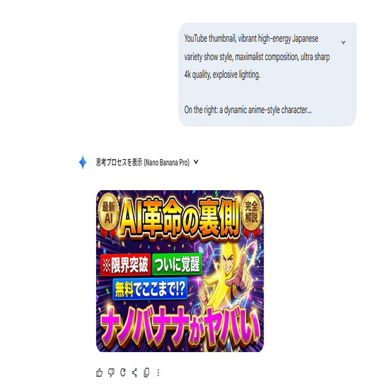 動画のサムネイルや本の表紙を作る際、「YouTubeのサムネイルを作りたい」と日本語で指示するだけ。