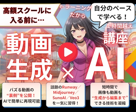 高額スクールは不要。動画生成AIのノウハウを74分の動画教材に凝縮。無料体験や本講座に誘導する手法を取らず、純粋に知りたい核心的な手順だけを価格を抑えて提供。サポートやコミュニティはなし。すぐに使える動画生成AIの全工程を一気に学びたい方向けの教材です。